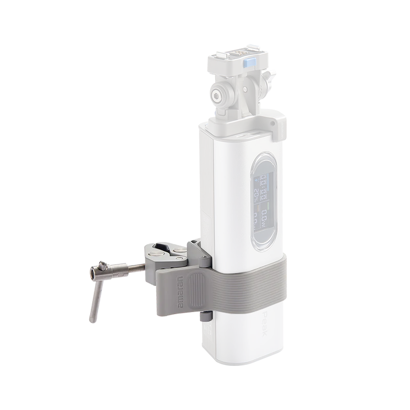The clamp features a custom silicone strap designed specifically for the Amaran Peak battery, ensuring a secure hold while preventing scratches or slipping. With a maximum clamping range of up to 5.87cm, it can easily mount onto various surfaces such as light stands, tripods, desks, and rigging equipment.