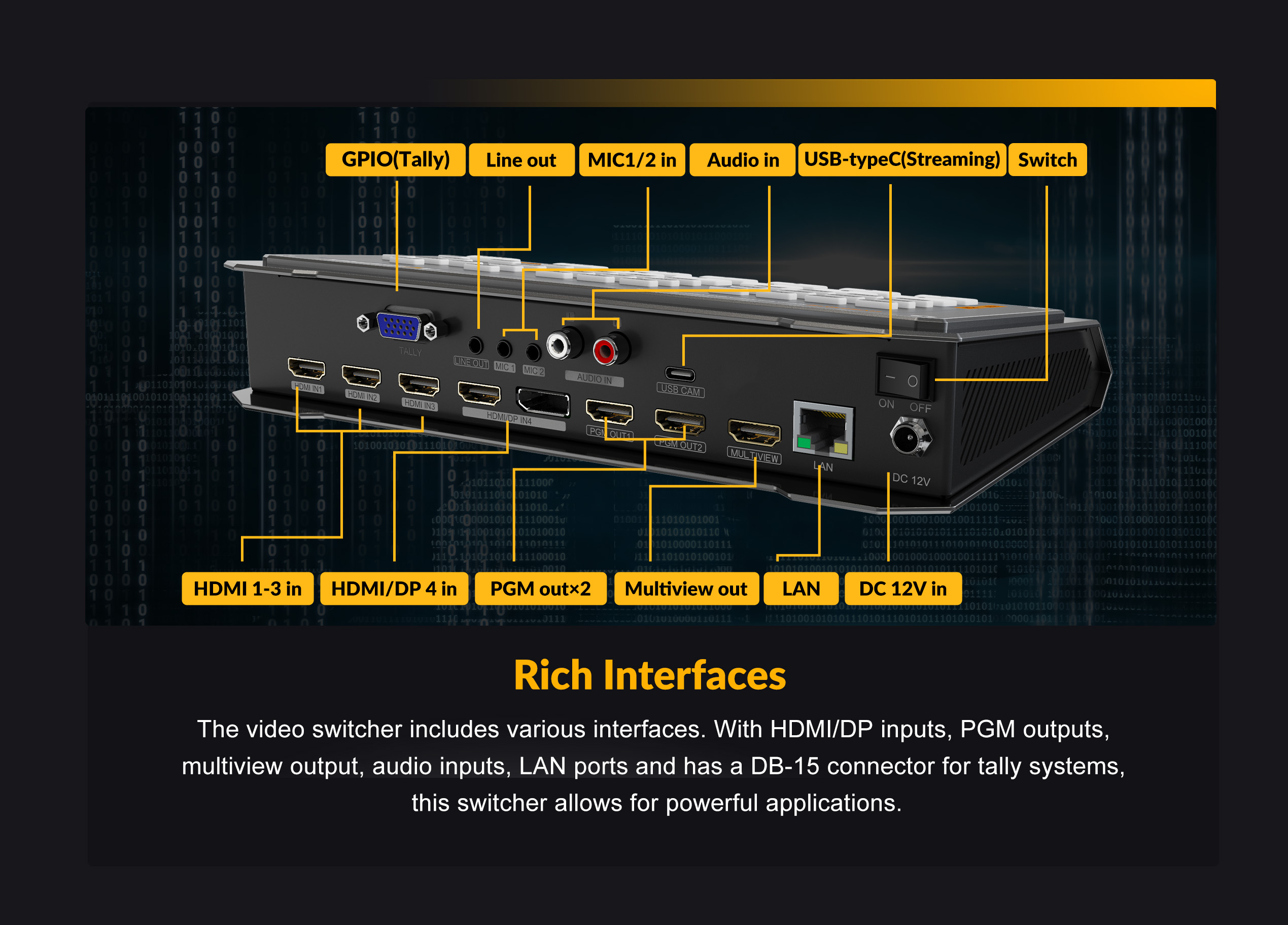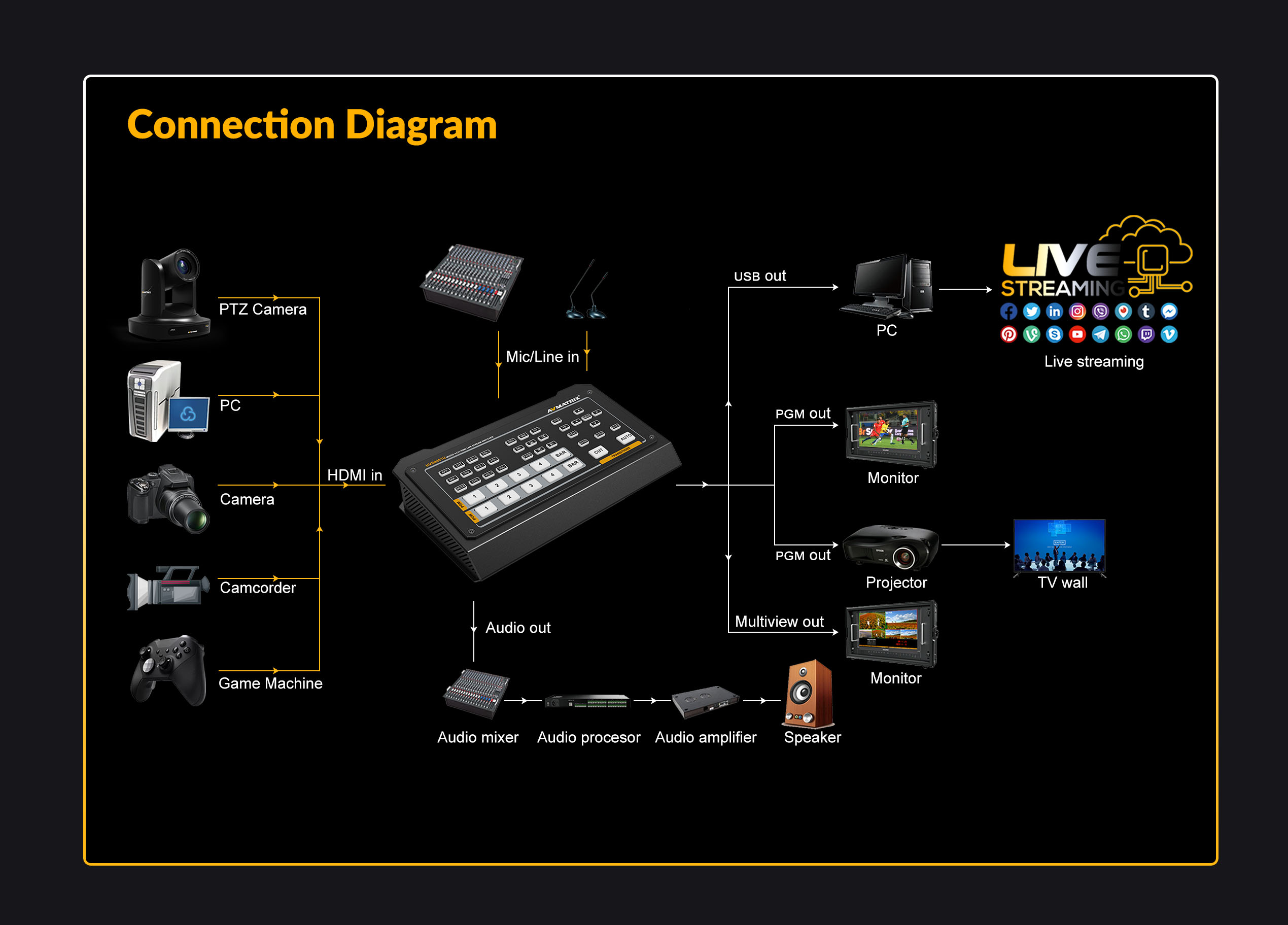 To enhance production flexibility, the switcher includes professional transition effects such as CUT, AUTO, MIX, FADE, and WIPE, as well as Picture-in-Picture (PiP) functionality for creative layouts. An integrated audio mixer supports microphone, RCA, and HDMI embedded audio inputs, ensuring balanced audio during live broadcasts.