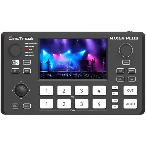 The Mixer Plus 4-Channel HDMI Streaming Video Switcher from CineTreak provides powerful mixing and live streaming for up to 1080p60 video and embedded audio. This compact switcher provides four HDMI inputs, two HDMI outputs, one LAN port, one USB-A UVC 3.0 output, two 3.5mm audio inputs, and a 3.5mm headphone output. It features a 4.5″ LCD screen with multiview, luma and chroma-keying, transition effects, and VISCA control for up to four PTZ cameras.