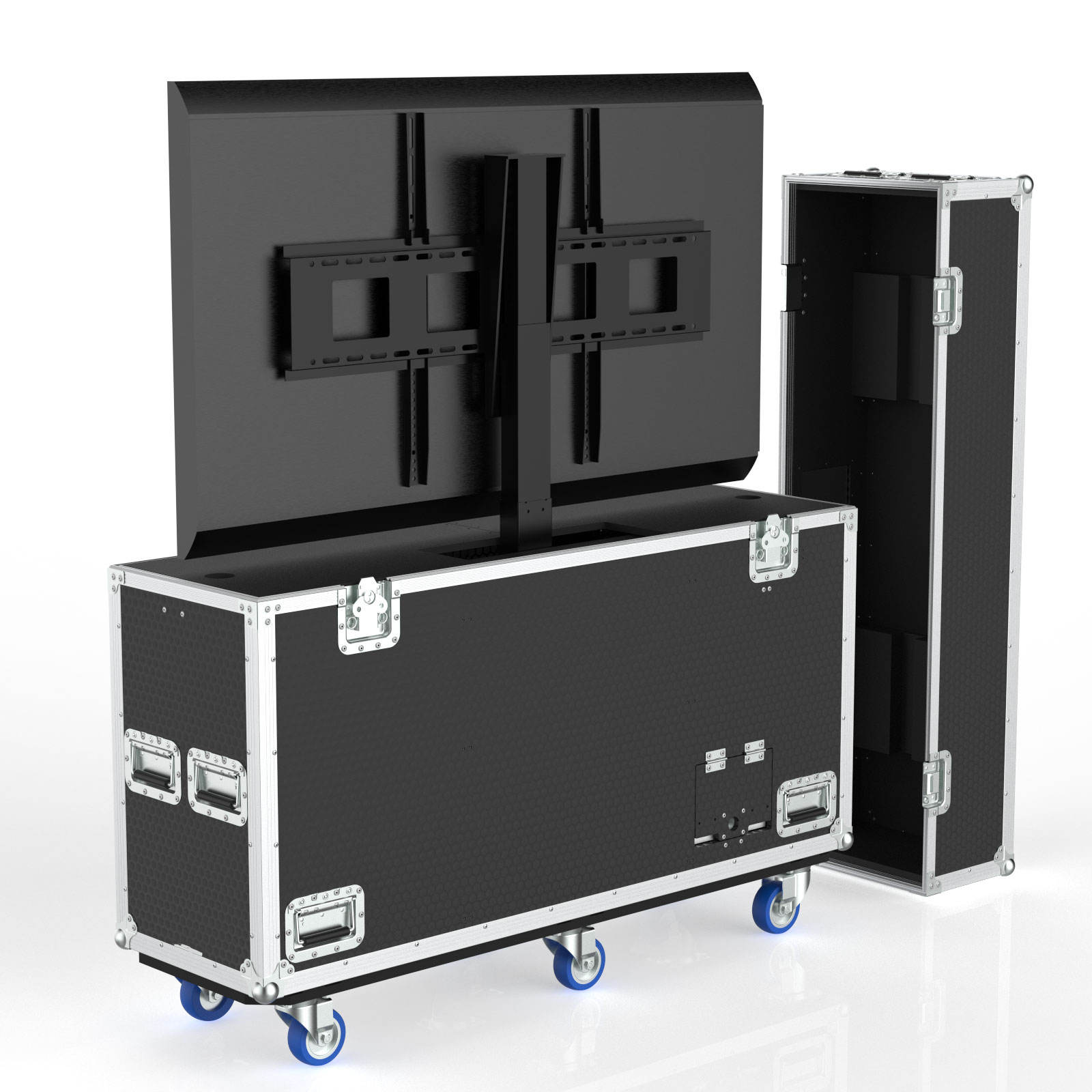 The sturdy construction with reinforced corners ensures maximum protection during transport, while the custom foam interior keeps your TV secure against shocks and vibrations. With smooth-rolling wheels, heavy-duty locks, and a sleek professional finish, it’s the ultimate solution for live events, exhibitions, broadcasting, and AV rentals.