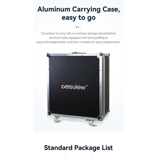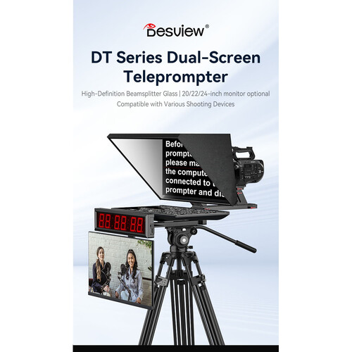 Record scripted presentations or broadcast video with the DT20-M Dual-Screen HDMI/3G-SDI Teleprompter from Desview. This prompter features two 20″ 1920 x 1080, HDMI and 3G-SDI monitors with high 1000 cd/m² brightness for easy viewing, one for your script and one for the talent to view themselves.