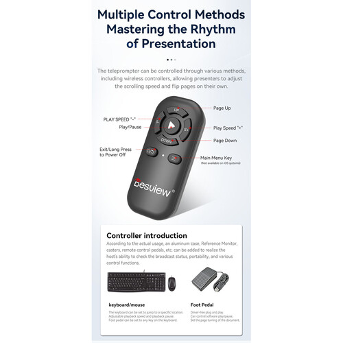 The included Bluetooth wireless remote control lets you adjust the prompting speed and flip pages from across the room. The foot pedal enables the talent or camera operator to control the software’s play/pause.