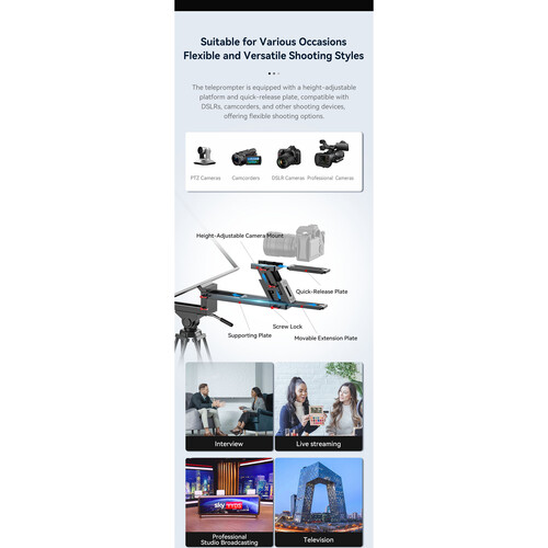 The included camera mount lets you adjust the height of the teleprompter to suit DSLR cameras, camcorders, and cinema cameras. The drawstring hood blocks extraneous light from entering your lens or flaring the monitor screen.