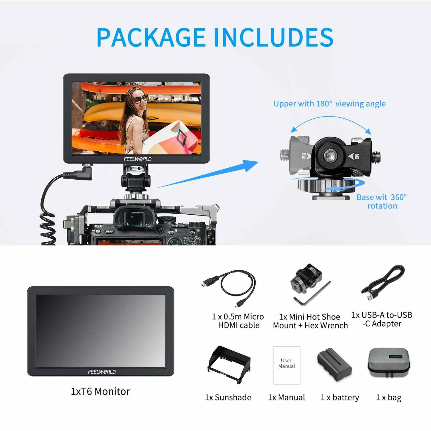 The FEELWORLD T6 is a professional 6-inch Full HD camera field monitor designed to deliver sharp visuals and reliable performance for filmmakers, photographers, and content creators. Featuring a 1920×1080 IPS display with 450nit brightness, it provides vibrant colors and wide 160° viewing angles, ensuring accurate monitoring even in dynamic shooting environments.