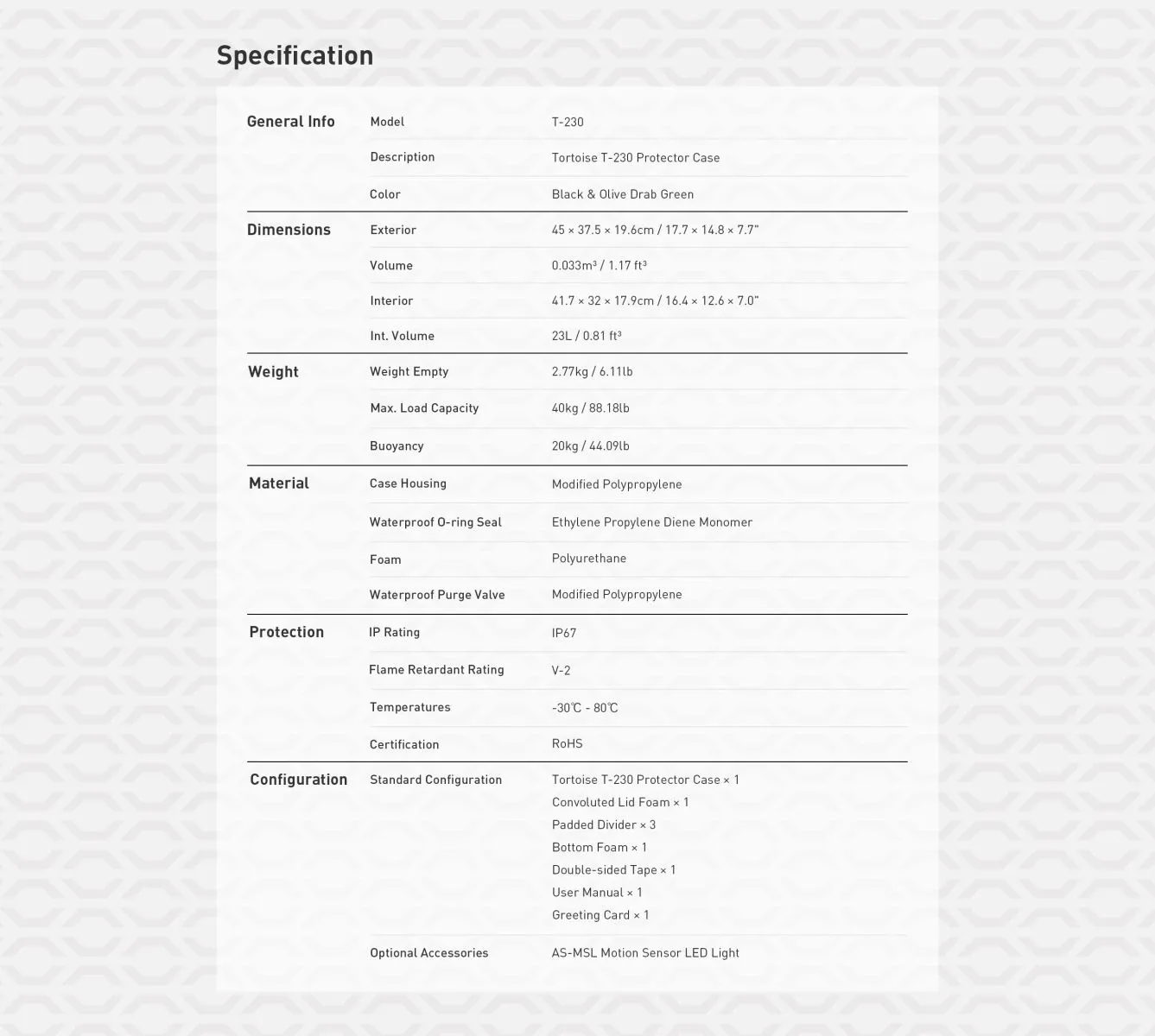 The T-230 is designed to be dustproof and waterproof to IP67 standards, protecting the contents of the case even in bad weather such as rain or snow.