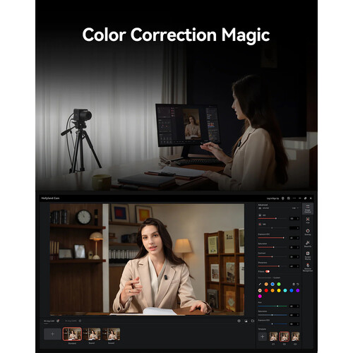 - Skin Beauty: Hollyland’s advanced beauty algorithm detects your face and skin to separate you from the background. It can also brighten your skin, smooth any texture, and correct tone.